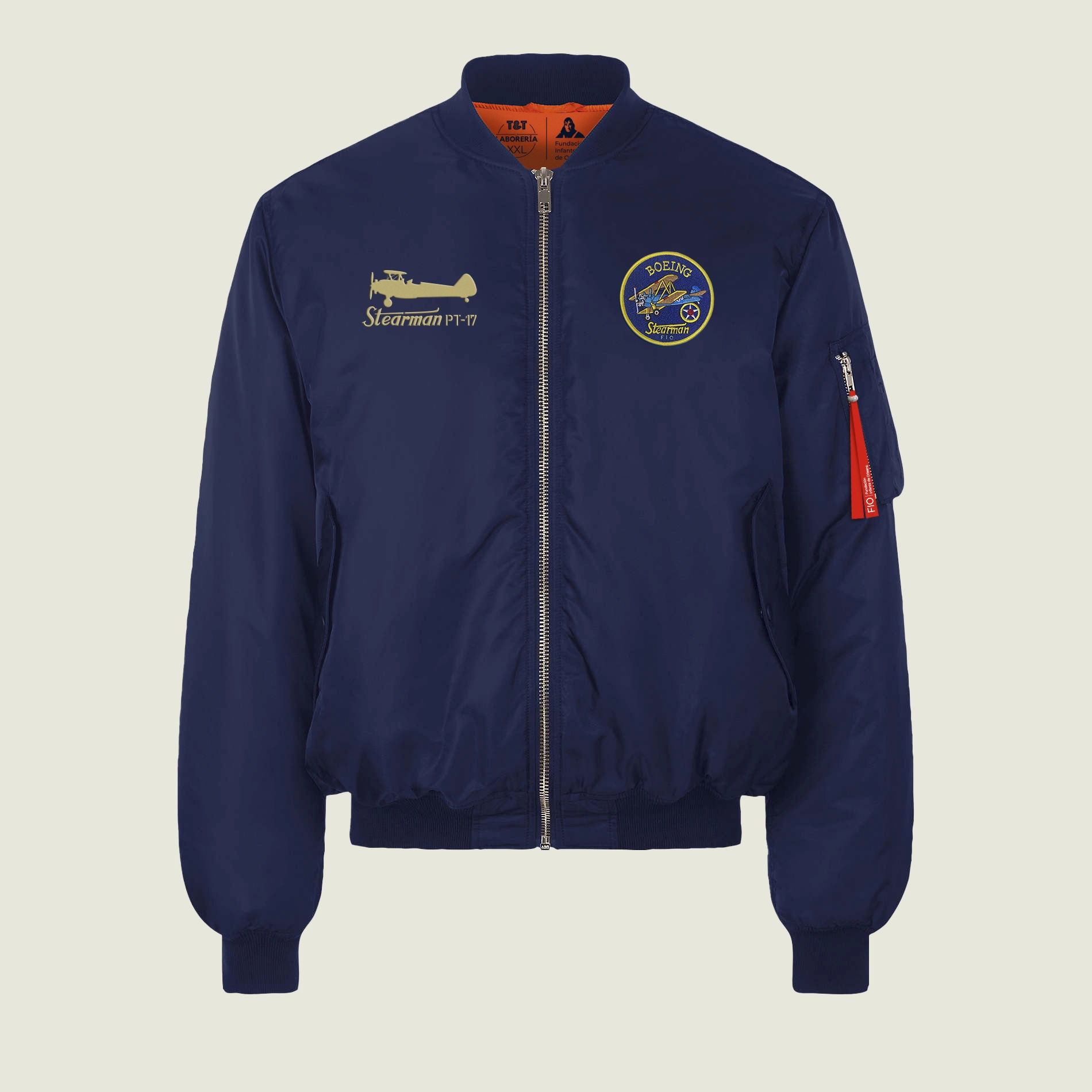 Desde la Fundación Infante de Orleans lanzamos esta exclusiva cazadora de aviador personalizada con tu nombre del histórico avión Boeing Stearman Kaydet. Desde nuestro taller de producción creamos esta cazadora manualmente y por ello es una edición exclusiva y limitada en bordado.
